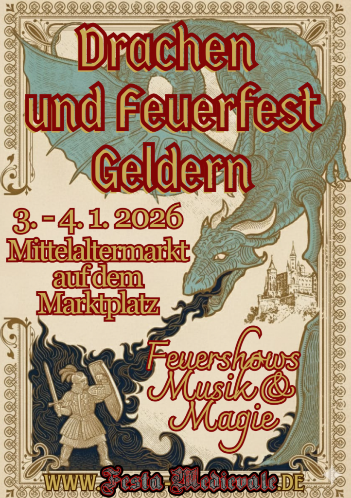 Das altbewährte Drachen- und Feuerfest erfährt durch die Expertise von Festa Medievale eine Wiederbelebung. Auf Wunsch und in Zusammenarbeit mit der Stadt Geldern wird das traditionsreiche, ehemals eintägige Fest auf zwei volle Tage – den 3. und 4. Januar – ausgedehnt, um das neue Jahr mit einem unvergesslichen Erlebnis einzuläuten.